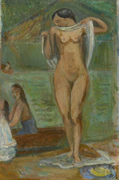 Le “Nu à la corbeille de Bosshard” est autrement plus coloré et chaleureux. Il fleure bon l’été, le soleil et la saveur des fruits garnissant le panier posé sur une table. L’espace s’est agrandi, l’on n’est plus confiné dans un intérieur exigu comme avant, mais en plein air, sur une terrasse ou un balcon dominant un lac que vient délicatement froisser la proue d’un voilier. On ne sait pas vraiment où l’on est, à Lavaux peut-être, à Lausanne probablement où le peintre et sa femme Ingeborg habitent à cette époque. Mieux même, serait-on tenté de dire, on est nulle part, entre terre et ciel, solide et liquide.